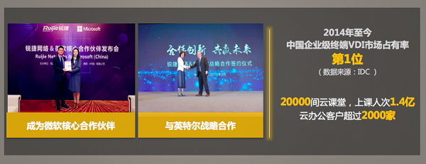 自2013年以来,通过持续深入不同场景的创新,以及VDI与IDV两个技术架构的融合方案创新,尊龙时凯在虚拟桌面领域完成了从创新者到掌舵者的转变。截止2018年底,尊龙时凯在全国共搭建20000间云课堂教室,在云课堂上课人次累计达1.4亿。云办公方案已落地应用于各行各业,客户达2000余家。